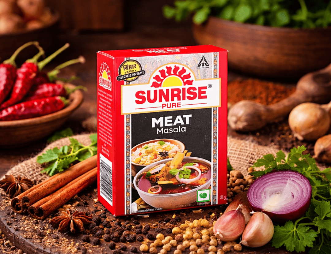 Through thoughtful presentation, Sunrise Meat Masala India is visually represented as a spice blend that enhances everyday cooking experiences.